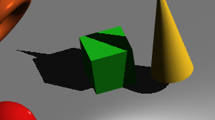 What do you see? If you have much of a depth bias, you may discover a new artifact — non-shadowed regions between the sphere and cube and their shadows. This occurs because the sphere and cube are sitting on the gray floor and faces of each surface overlap.