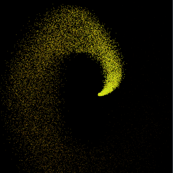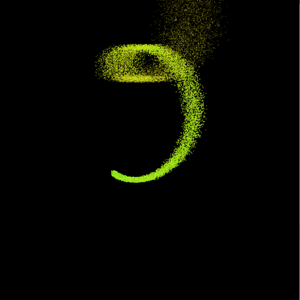 For extra credit, save a copy of your plume sketch with the name plume_ec and modify the copy so that the emitter moves in an interesting way. The pictures below show snapshots of two variations on a spiral motion as examples of the kind of thing you might do, but feel free to try other things. You may also want to modify aspects of the sparks' initialization; that was done in the second case, in fact, the emitter is animated the same way in both sketches and the differences are due to how the sparks are initialized.